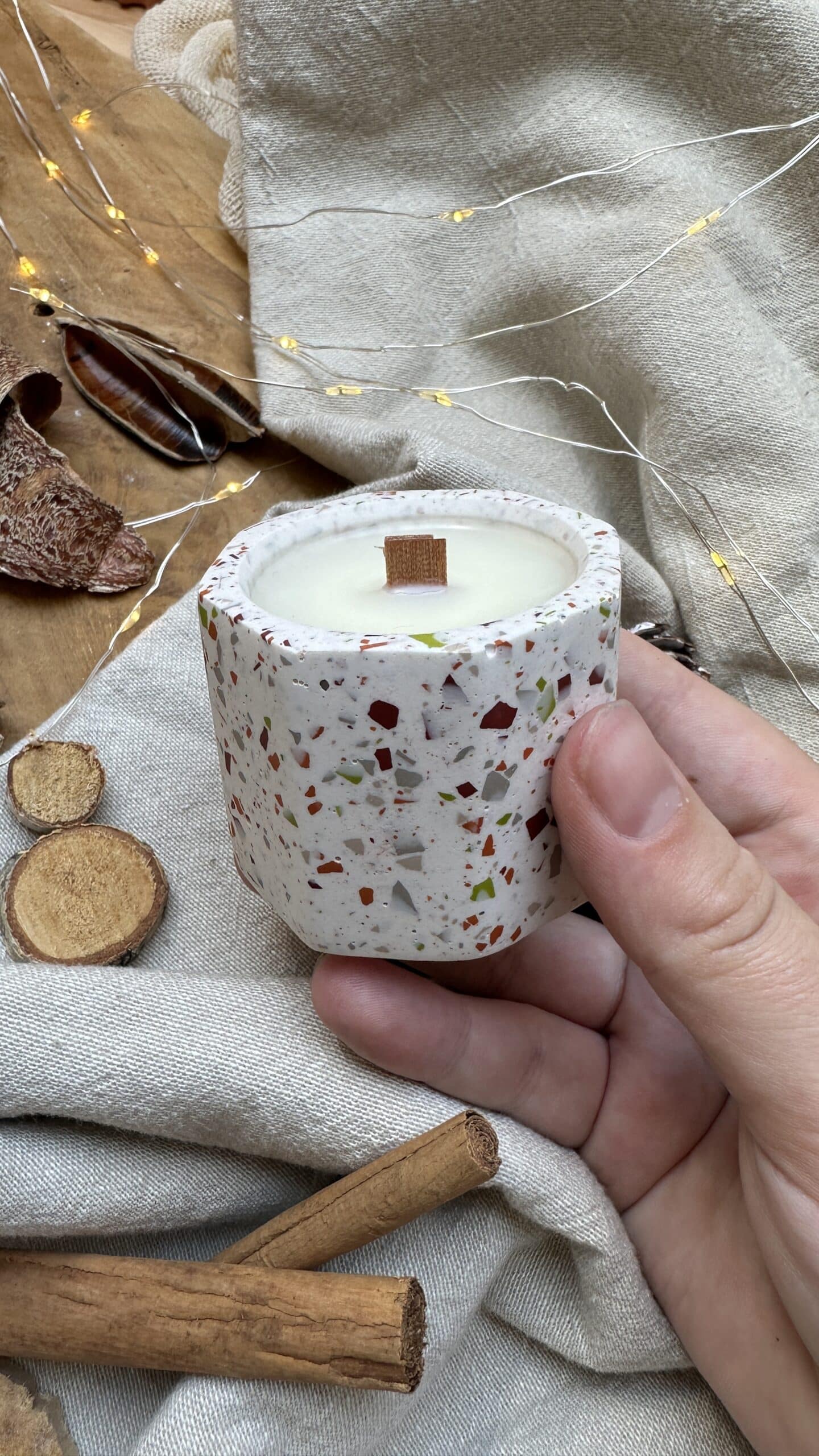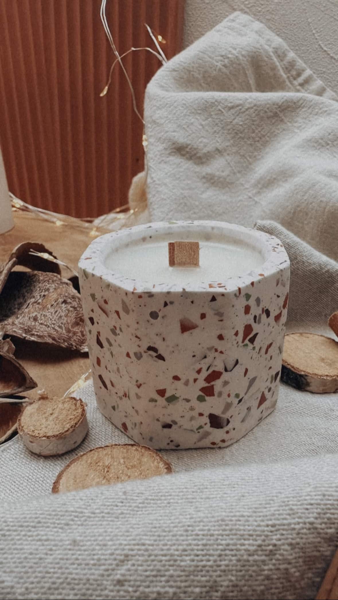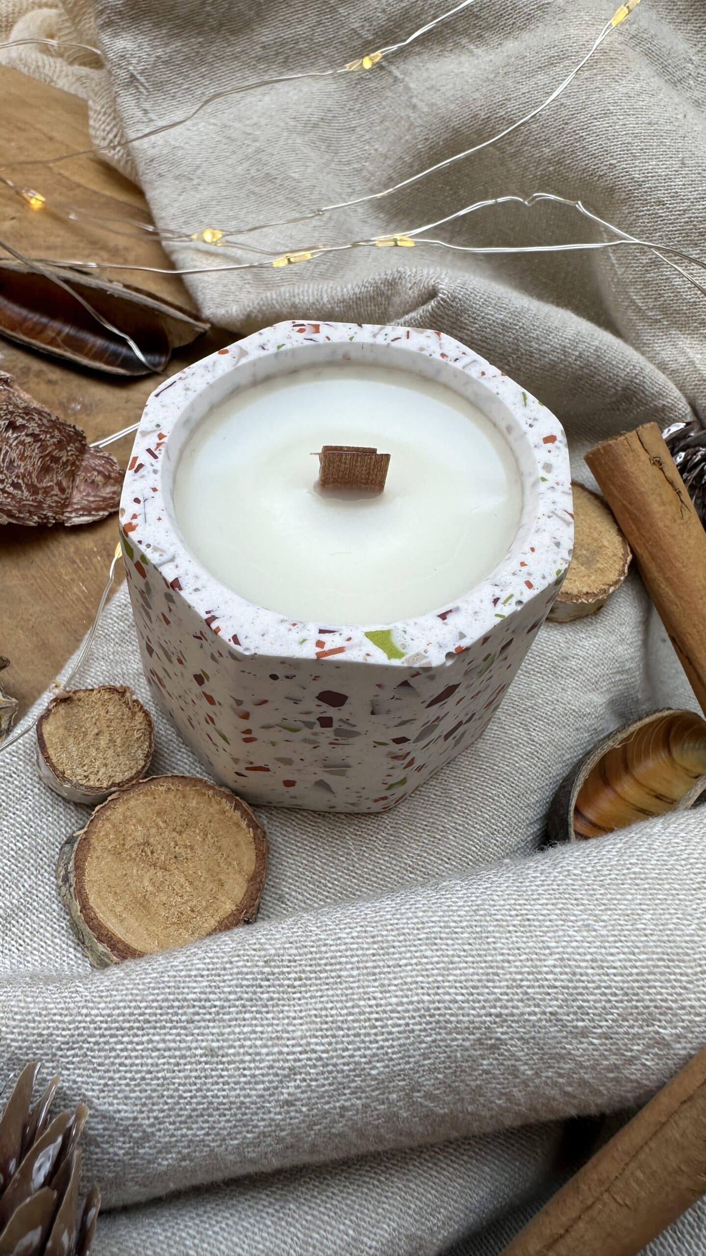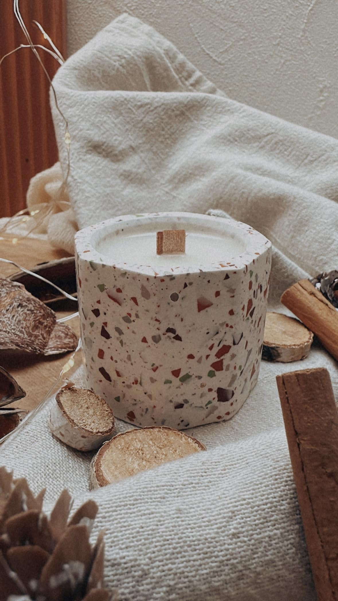 The pumpkin spice scented candle is the perfect gift for all autumn lovers. With its pretty orange, burgundy, taupe, beige and green terrazzo white pot. Pretty autumn tones.