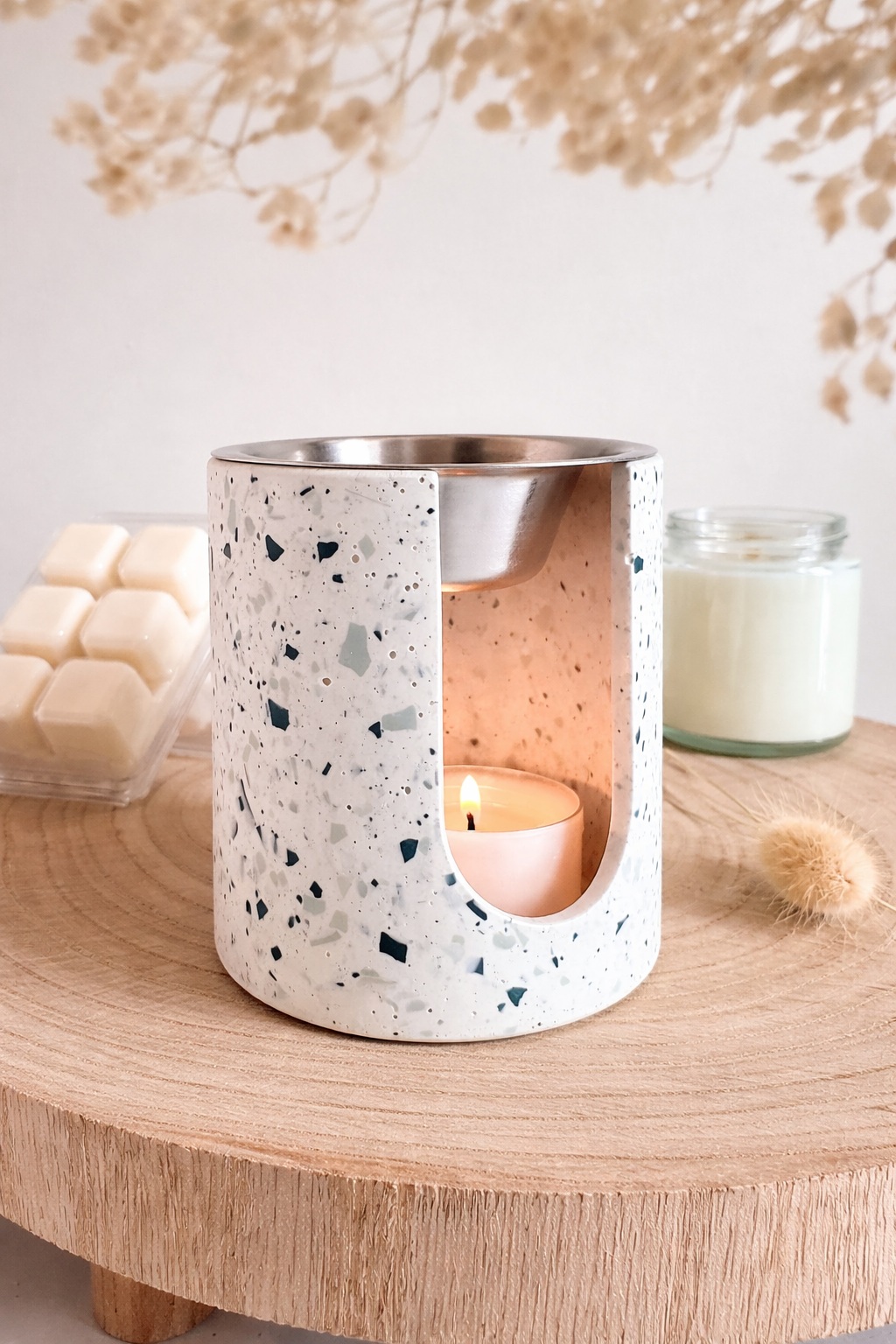 Alliez esthétique et bien-être avec ce brûleur de fondant en terrazzo. Son design épuré, tout en courbes douces, se distingue par un fond blanc délicat rehaussé d’éclats bleu, pour une ambiance douce et contemporaine.