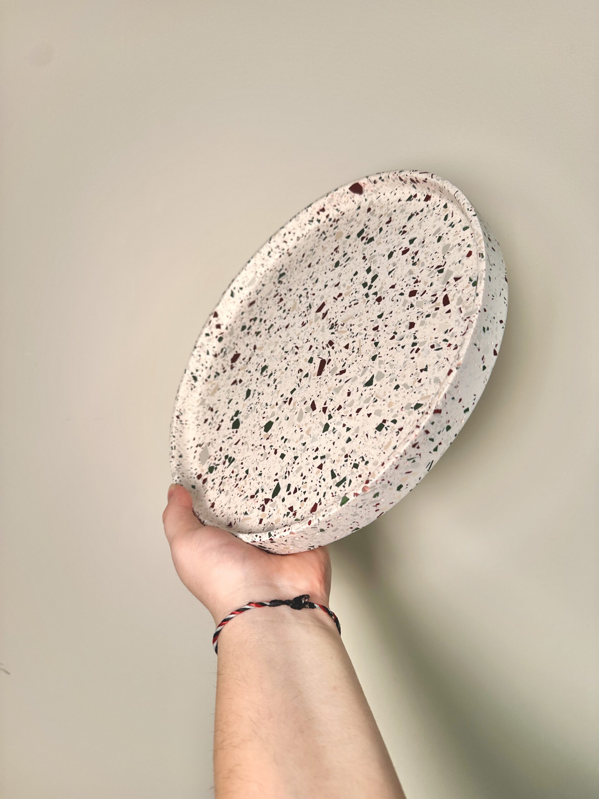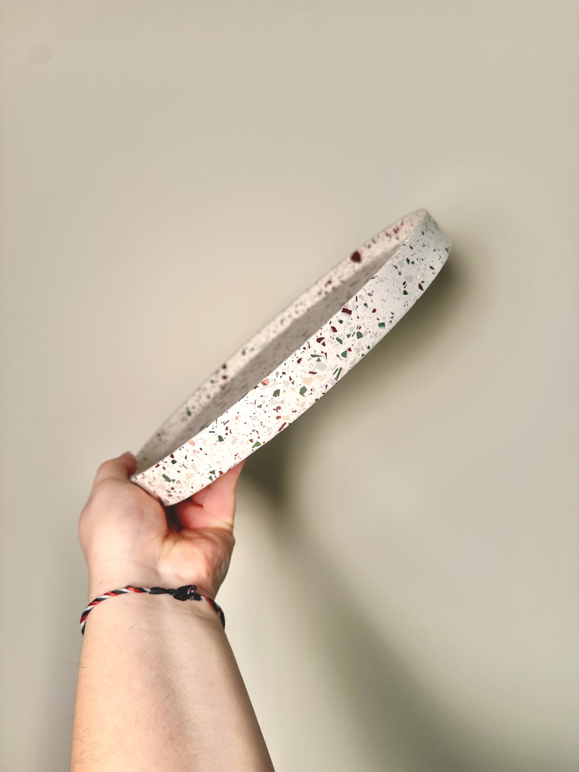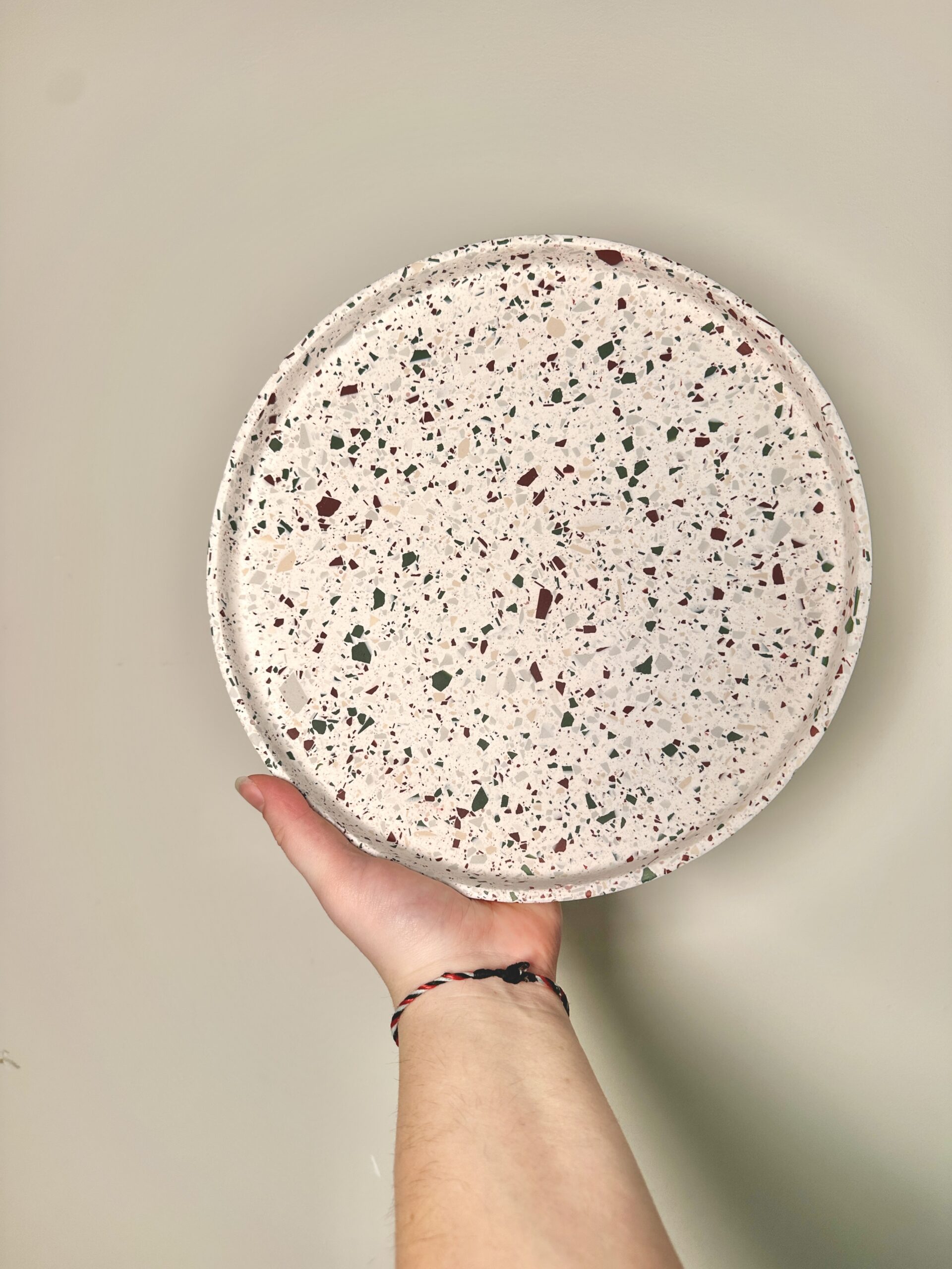 Plongez dans l’élégance artisanale avec notre plateau en terrazzo de 25 cm de diamètre, minutieusement confectionné à la main dans notre atelier. Chaque pièce est fabriquée grâce à une résine écologique aux nuances captivantes de Bordeau, vert, gris et beige créant ainsi un motif unique et irrésistiblement moderne. Ce plateau non seulement embellit votre espace avec son esthétique contemporaine, mais incarne également notre engagement envers la durabilité environnementale grâce à l’utilisation de matériaux écologiques.