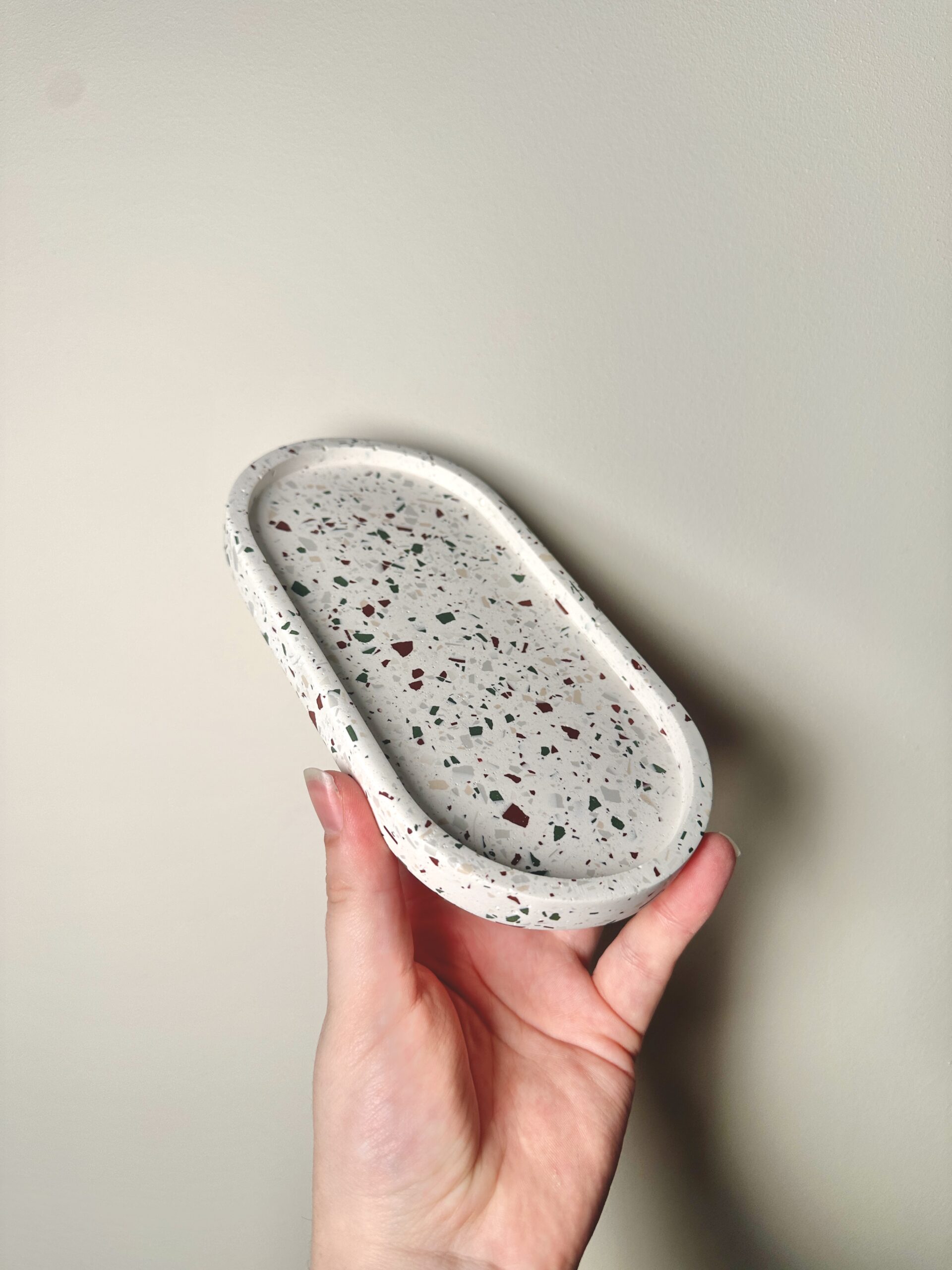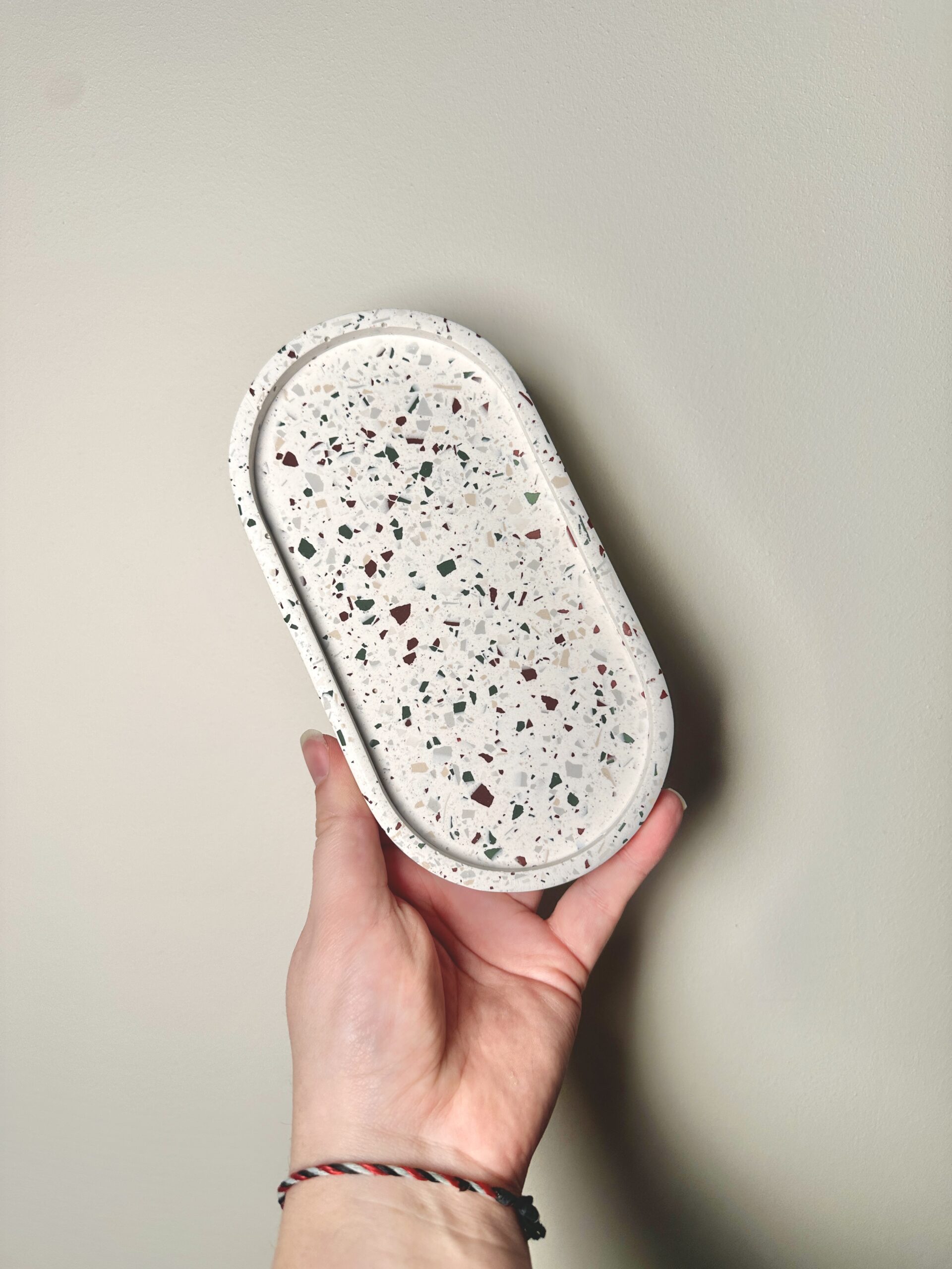 Apportez une touche d’élégance moderne à votre intérieur avec ce plateau ovale en jesmonite, inspiré du terrazzo. Son fond Blanc pur est parsemé d’éclats de Bordeau, vert, gris et beige, créant un contraste doux et raffiné. Chaque pièce est entièrement faite à la main, rendant chaque motif unique.