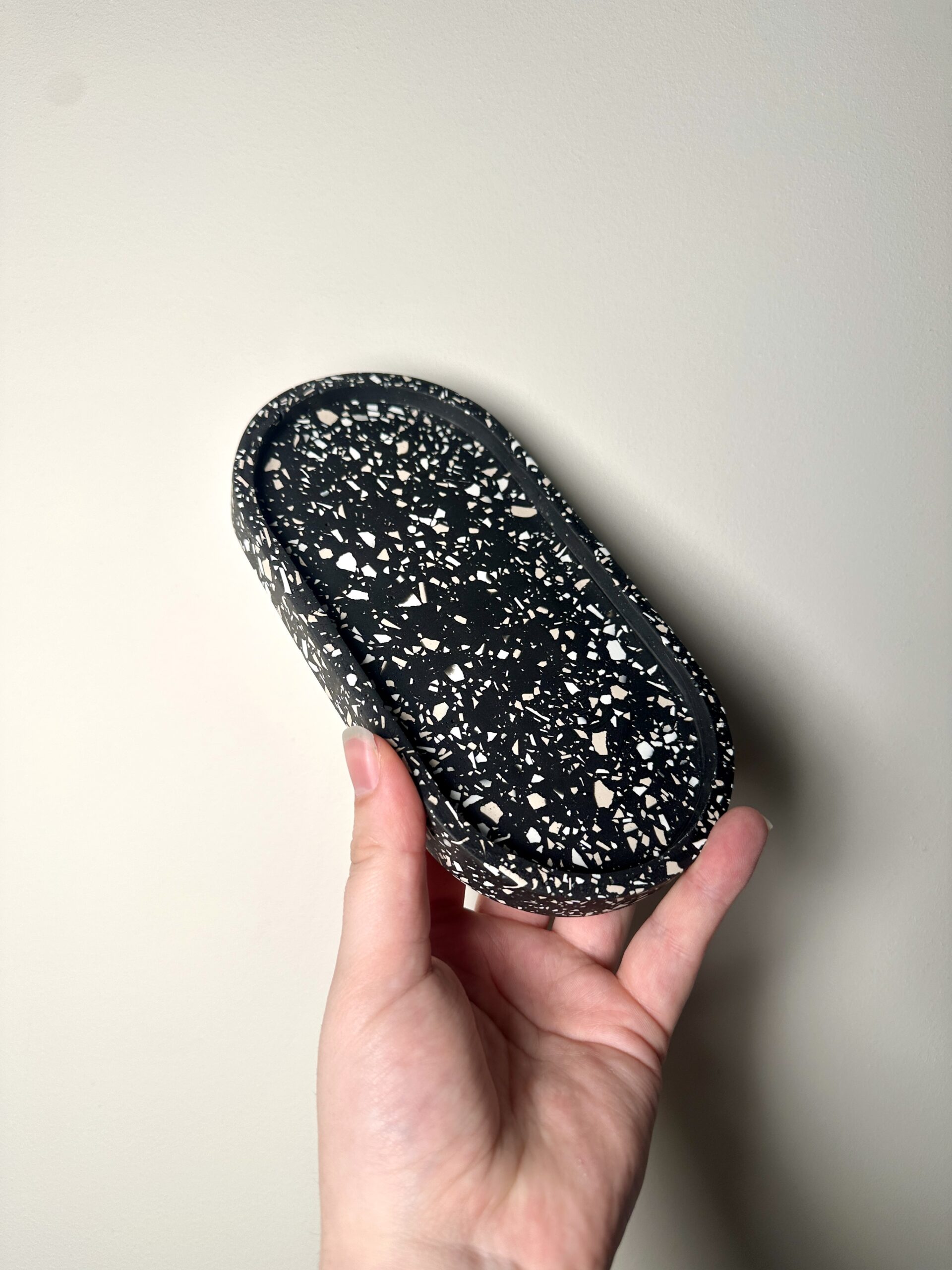 Apportez une touche d’élégance moderne à votre intérieur avec ce plateau ovale en jesmonite, inspiré du terrazzo. Son fond blanc pur est parsemé d’éclats de Beige et blanc, créant un contraste doux et raffiné. Chaque pièce est entièrement faite à la main, rendant chaque motif unique.