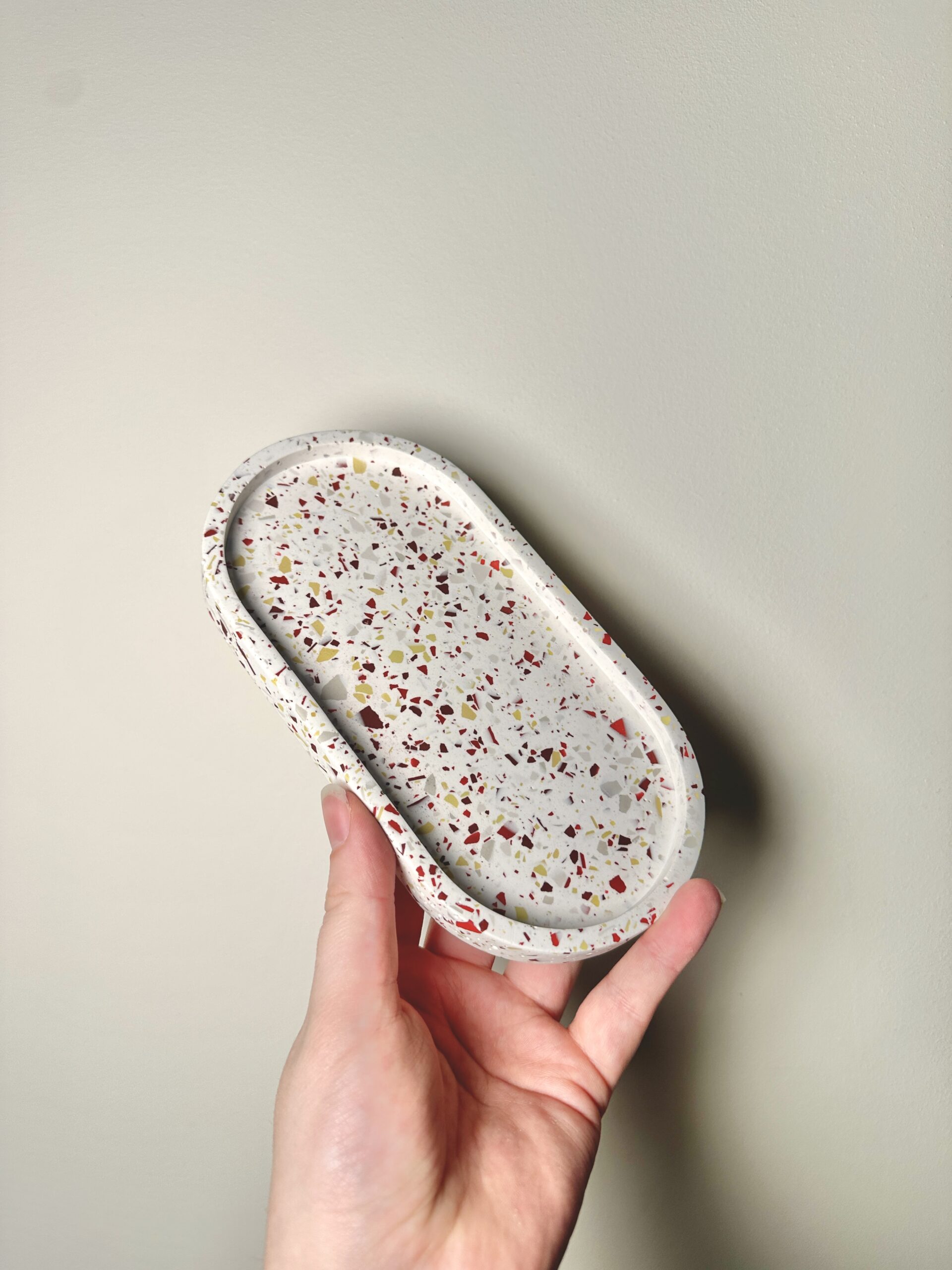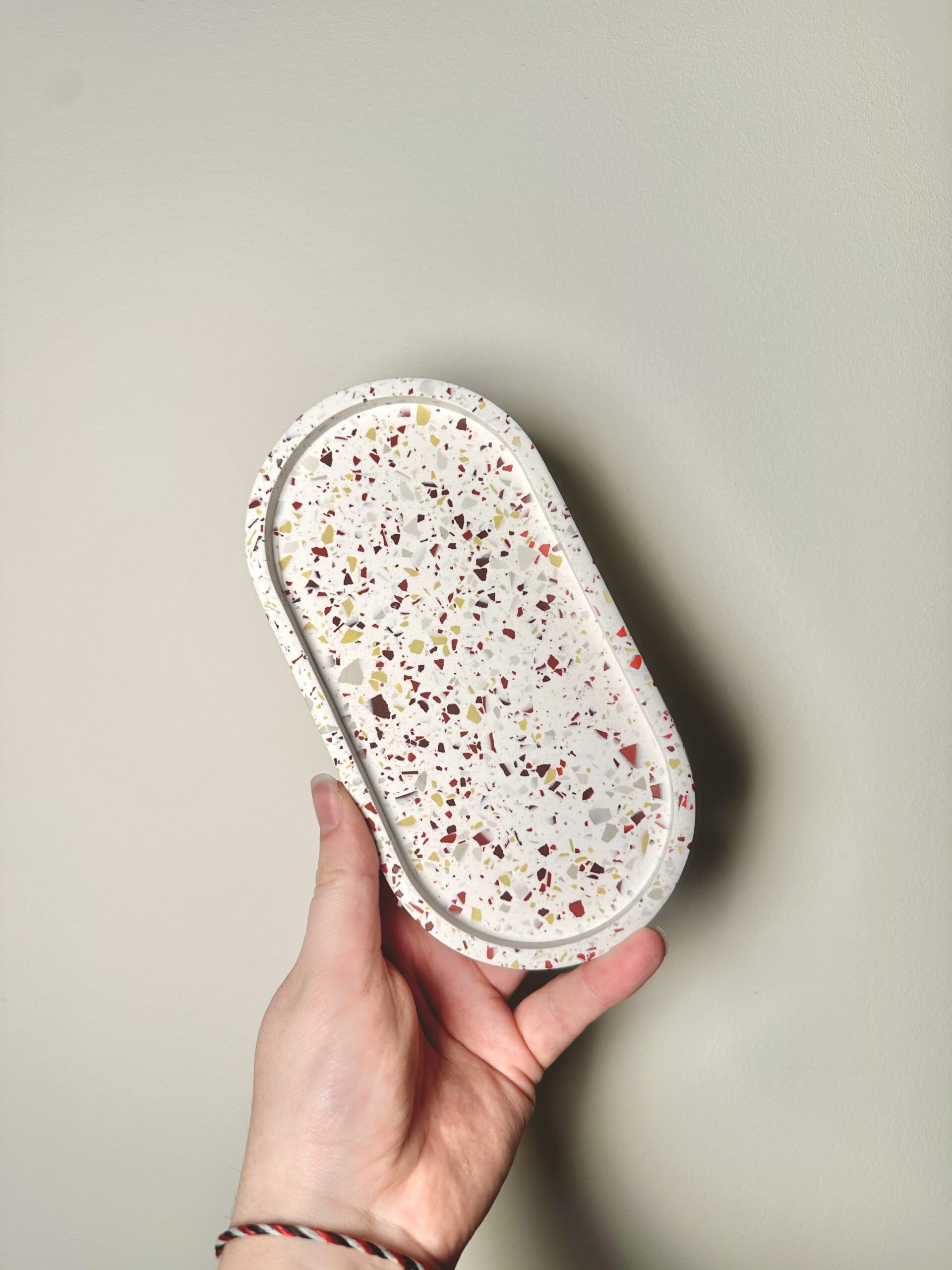 Ajoutez une touche d’artisanat contemporain à votre décoration avec ce plateau terrazzo au charme subtil.