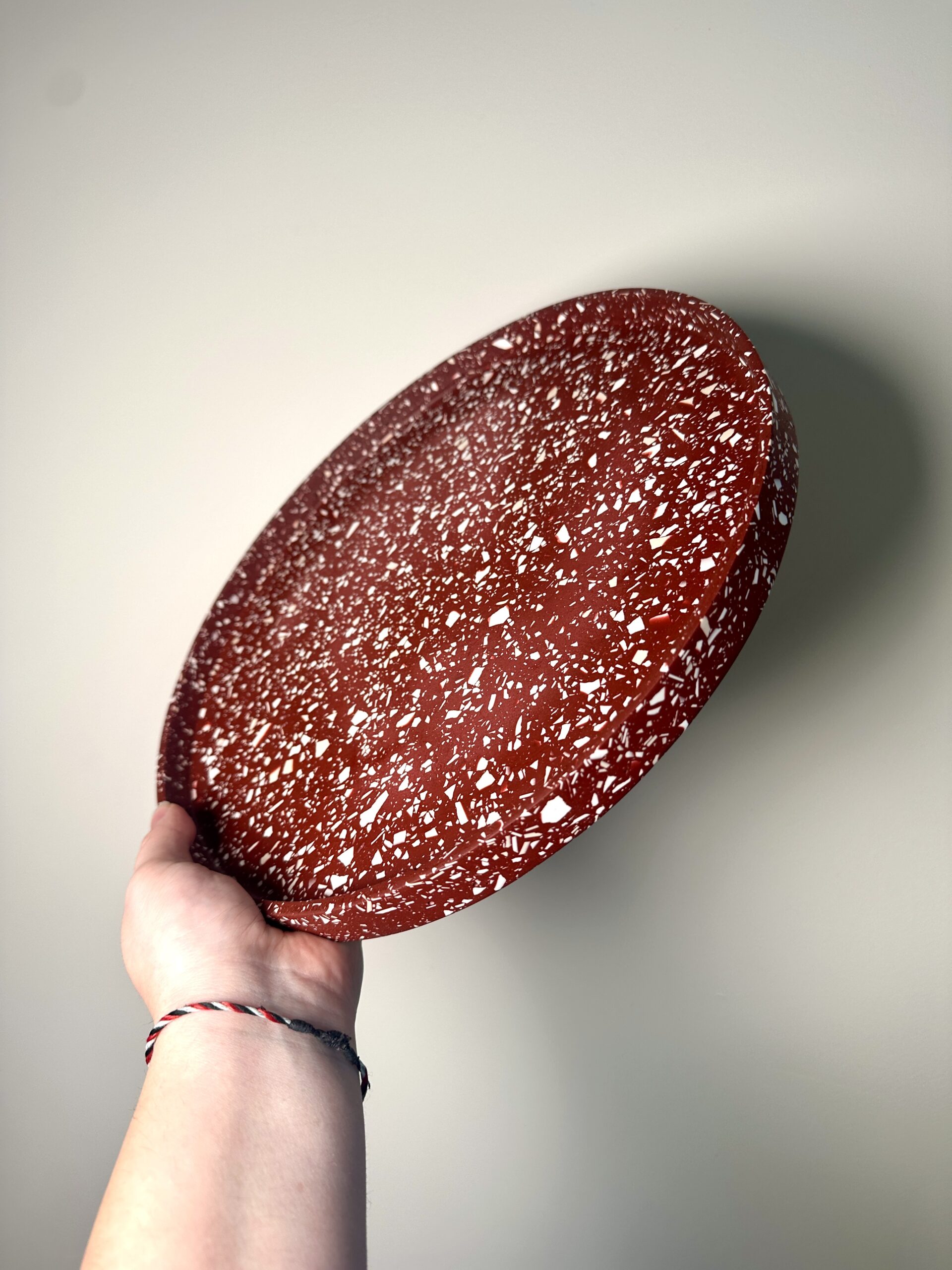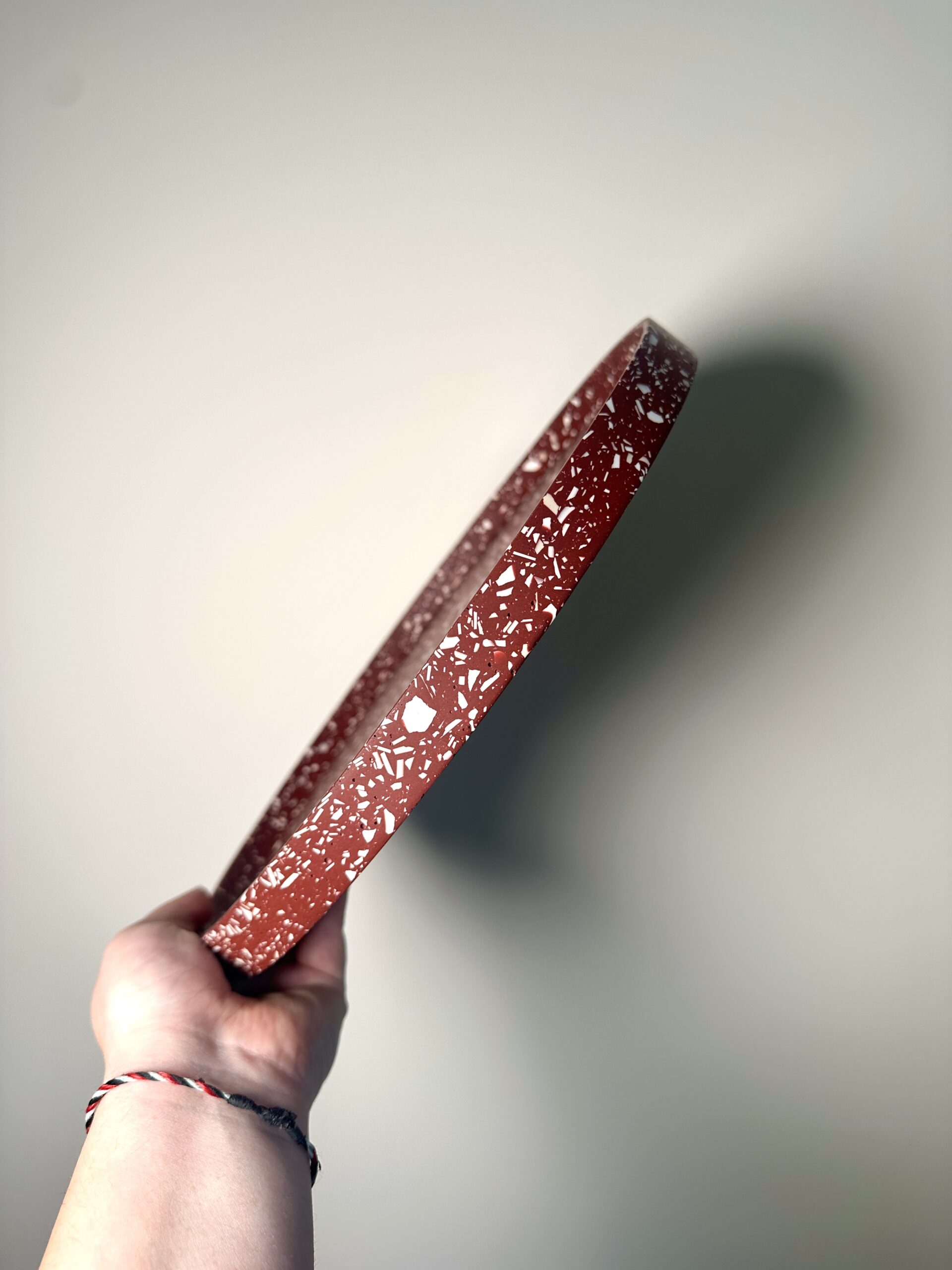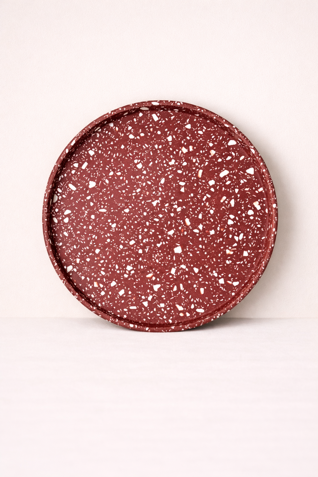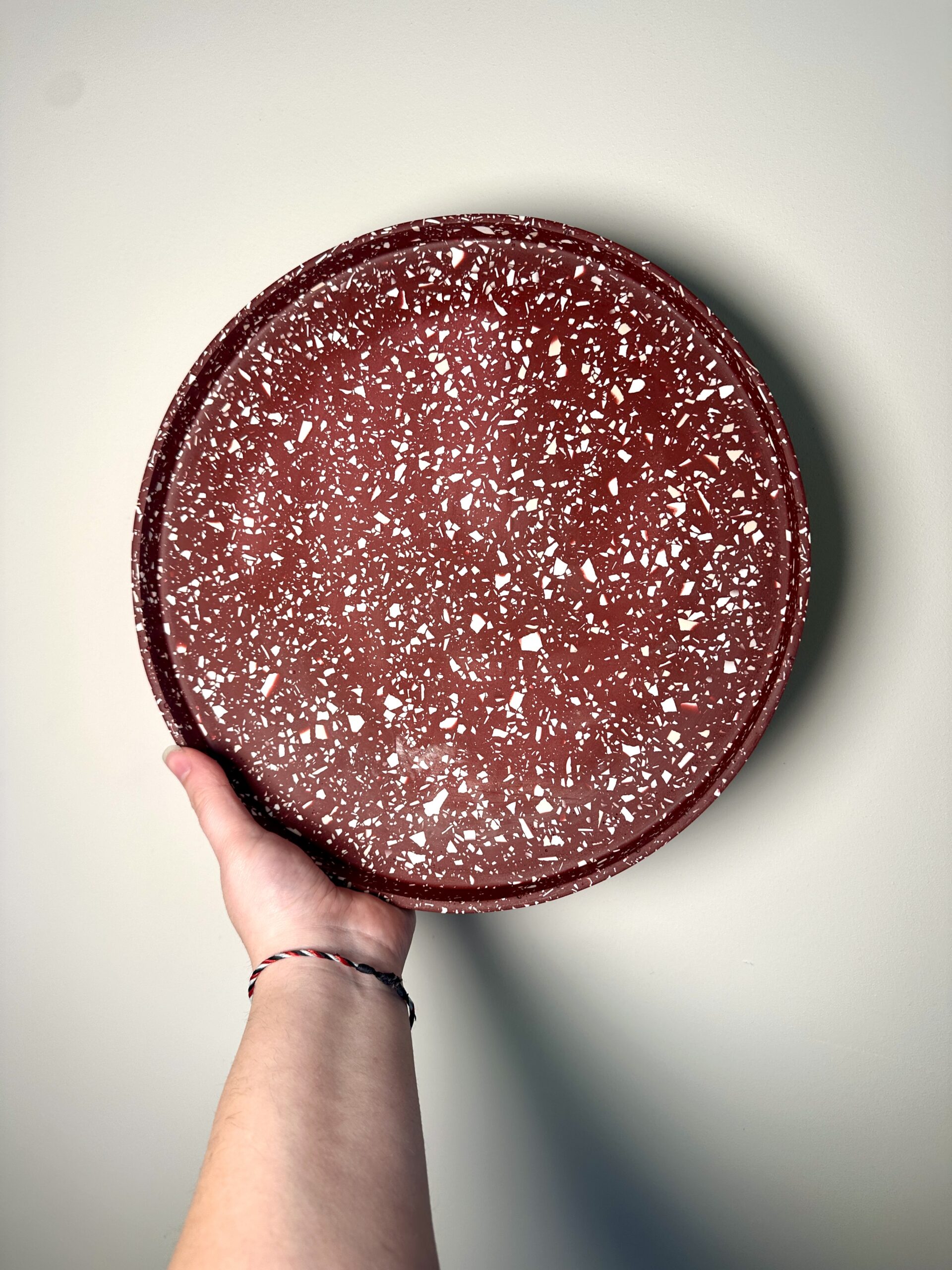 Plongez dans l’élégance artisanale avec notre plateau en terrazzo de 30 cm de diamètre, minutieusement confectionné à la main dans notre atelier. Chaque pièce est fabriquée grâce à une résine écologique aux nuances captivantes de Beige et Blanc sur fond bordeaux créant ainsi un motif unique et irrésistiblement moderne. Ce plateau non seulement embellit votre espace avec son esthétique contemporaine, mais incarne également notre engagement envers la durabilité environnementale grâce à l’utilisation de matériaux écologiques.