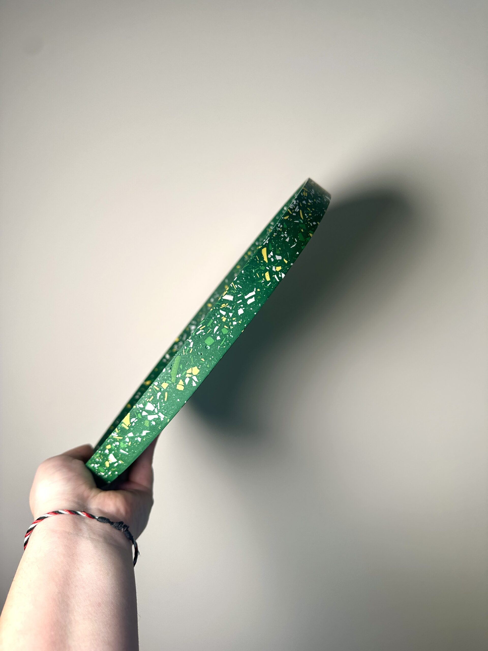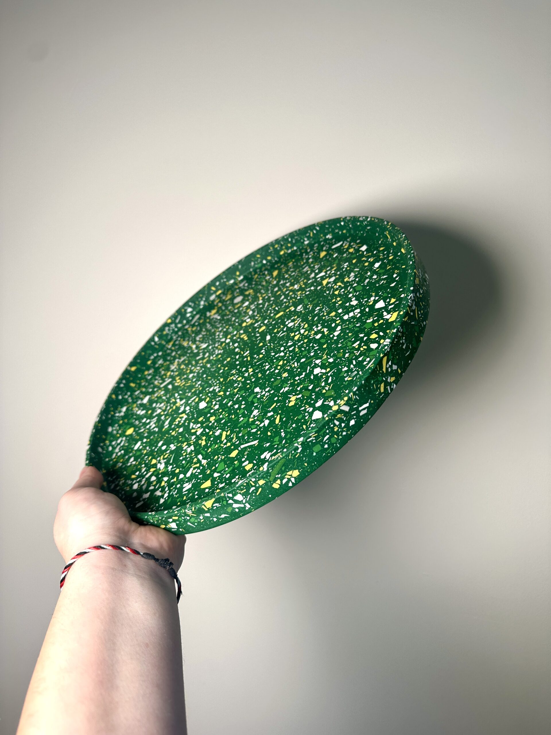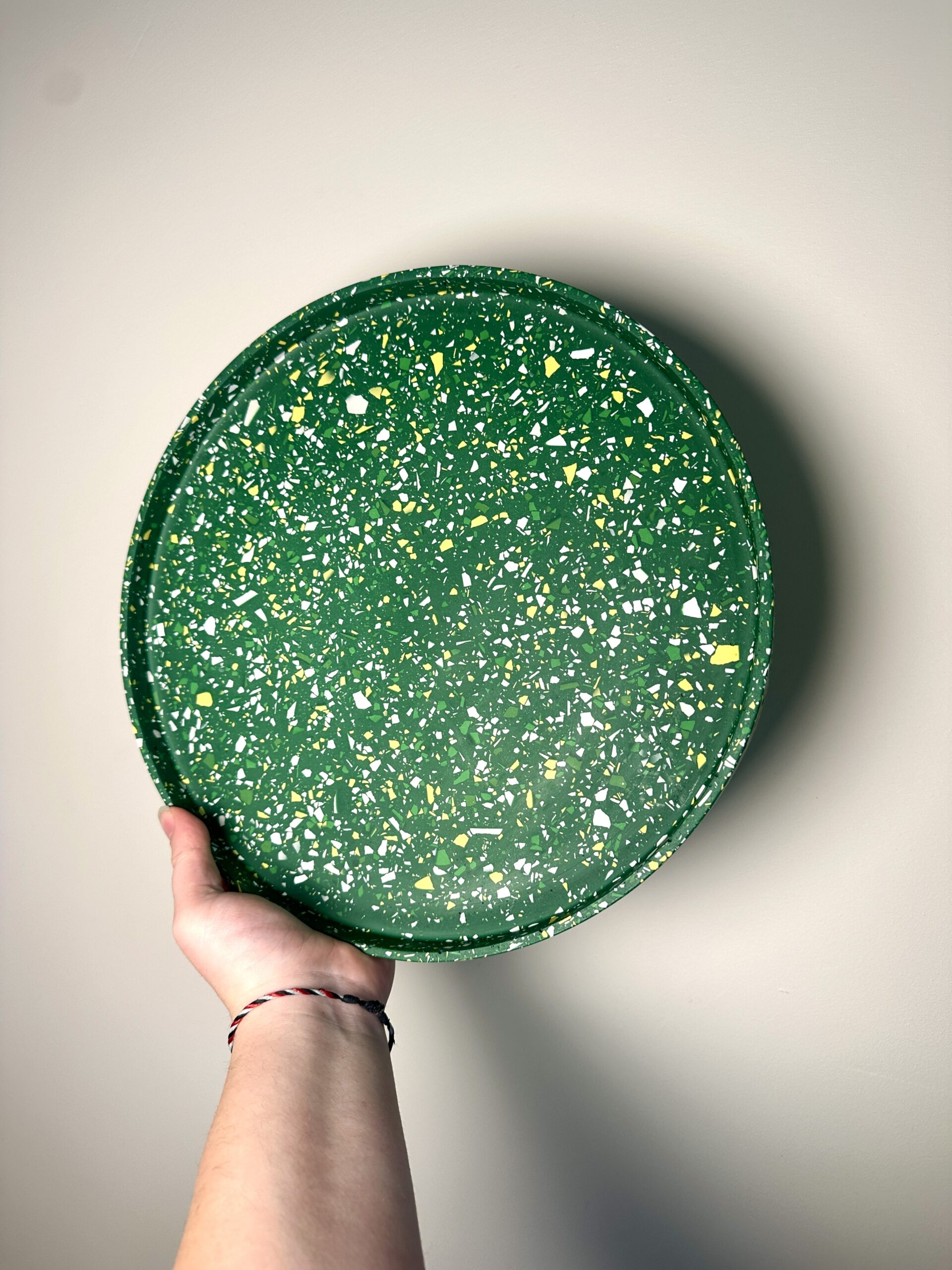 Plongez dans l’élégance artisanale avec notre plateau en terrazzo de 30 cm de diamètre, minutieusement confectionné à la main dans notre atelier. Chaque pièce est fabriquée grâce à une résine écologique aux nuances captivantes de Blanc, vert, jaune et gris sur fond vert créant ainsi un motif unique et irrésistiblement moderne. Ce plateau non seulement embellit votre espace avec son esthétique contemporaine, mais incarne également notre engagement envers la durabilité environnementale grâce à l’utilisation de matériaux écologiques.