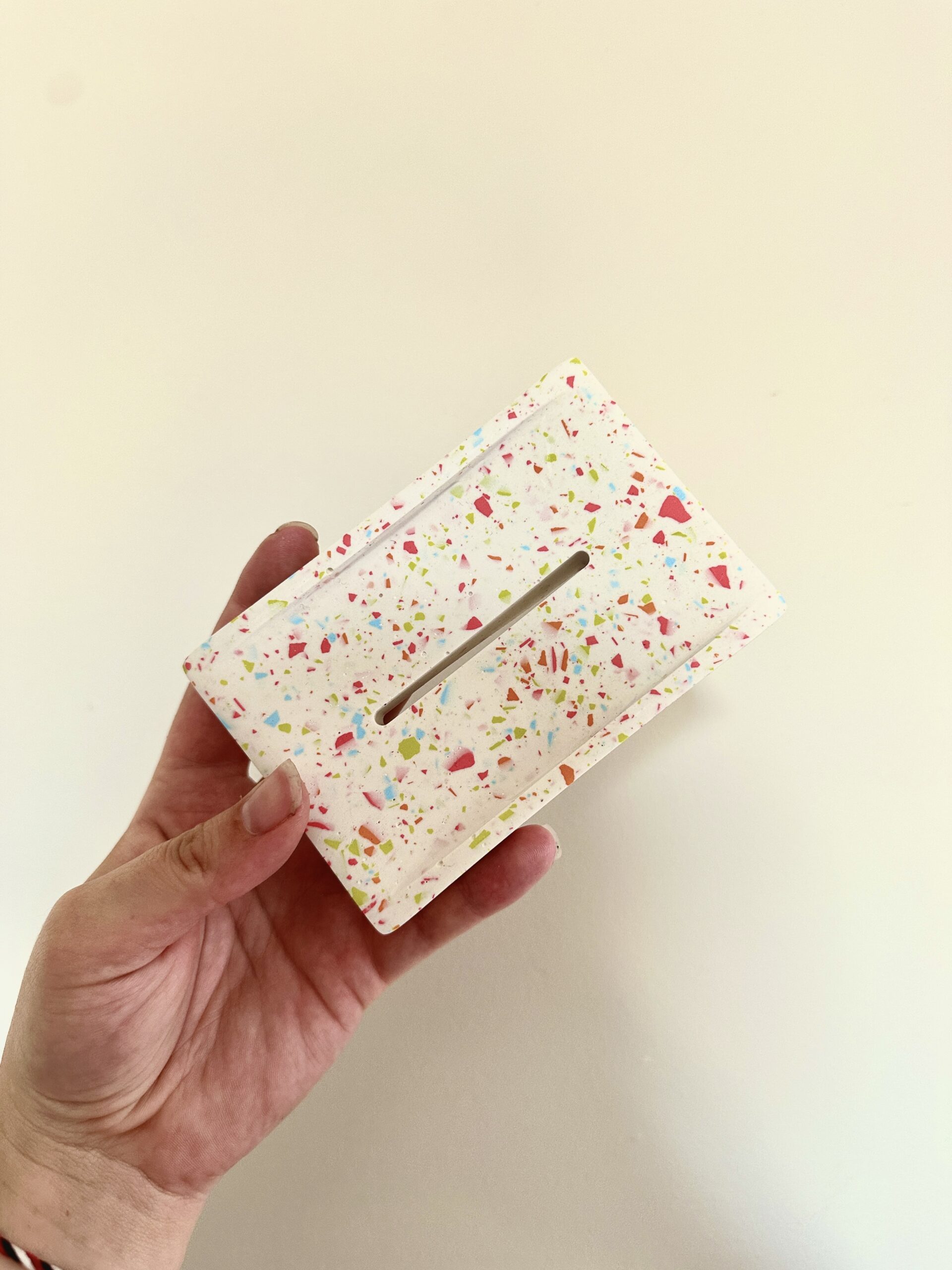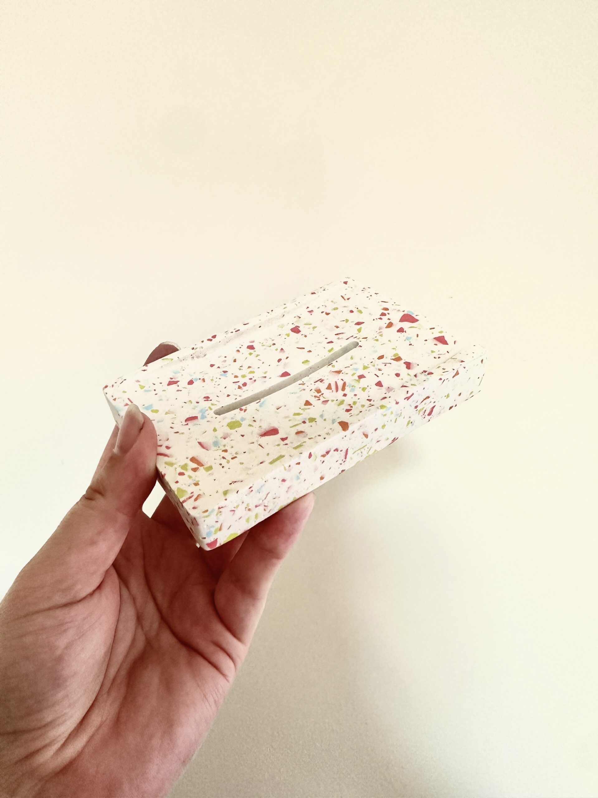 Apportez une touche de douceur et de modernité à votre salle de bain avec ce porte-savon en jesmonite, réalisé dans un style terrazzo raffiné. Son fond blanc éclatant est ponctué d’éclats de rose, orange, vert et bleu pour un rendu délicat et tendance.