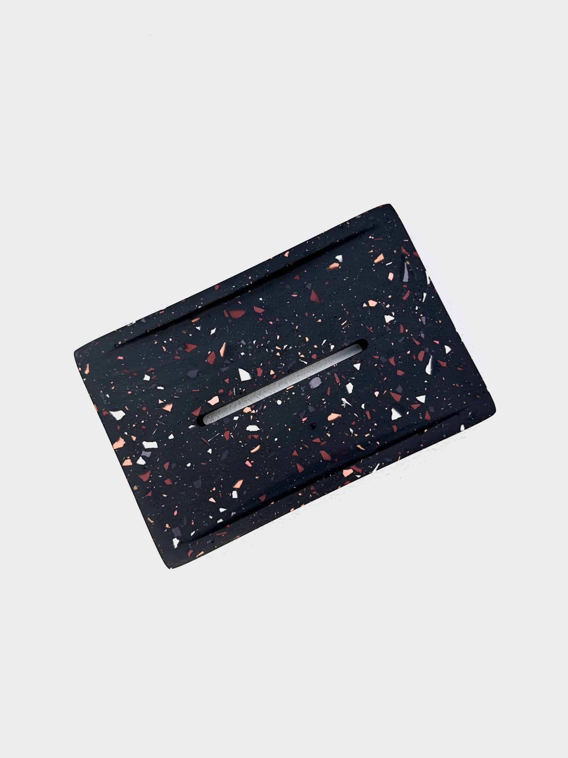 Apportez une touche de douceur et de modernité à votre salle de bain avec ce porte-savon en jesmonite, réalisé dans un style terrazzo raffiné. Son fond noir éclatant est ponctué d’éclats de violet, bordeaux, pêche, blanc pour un rendu délicat et tendance.