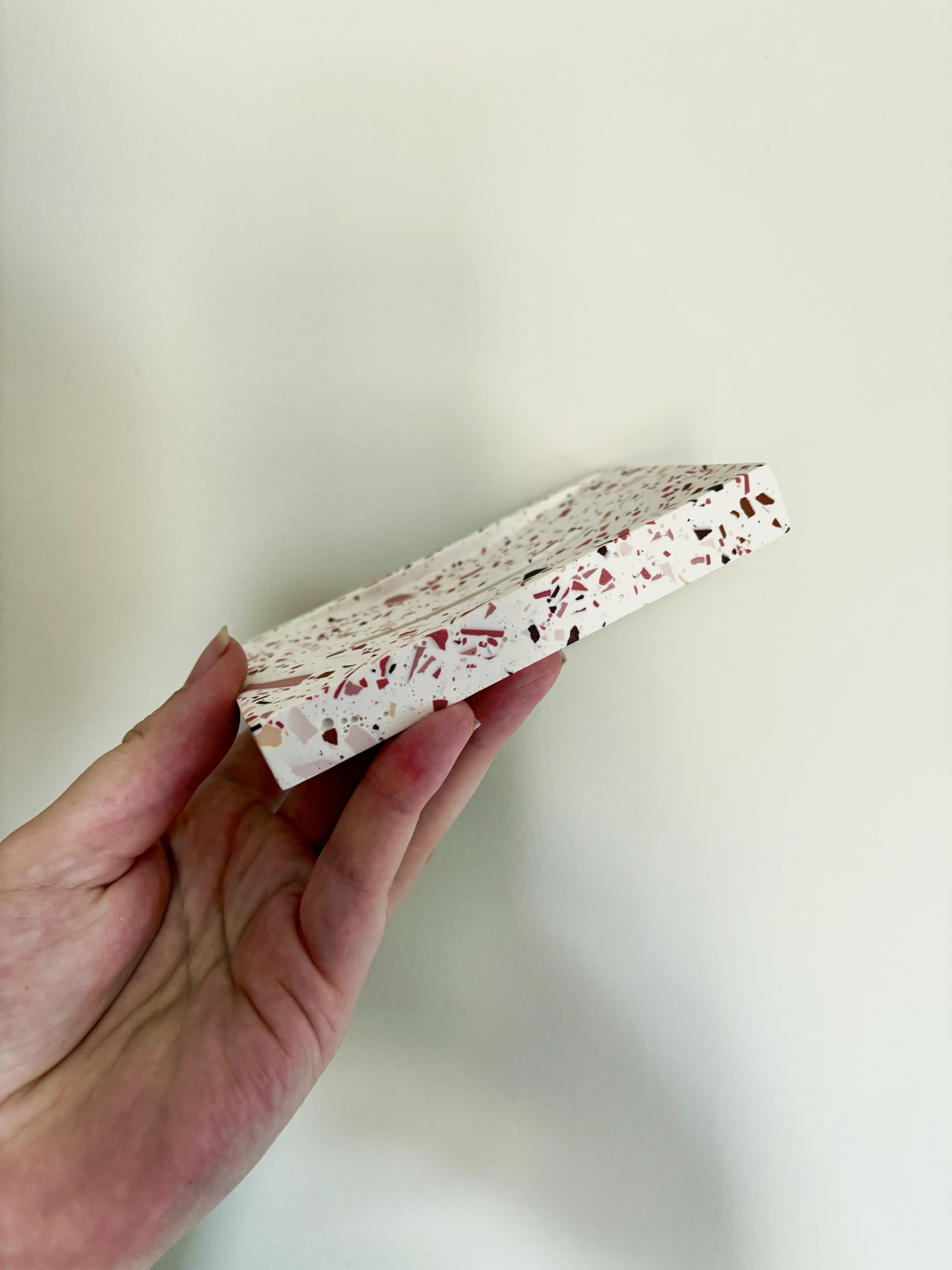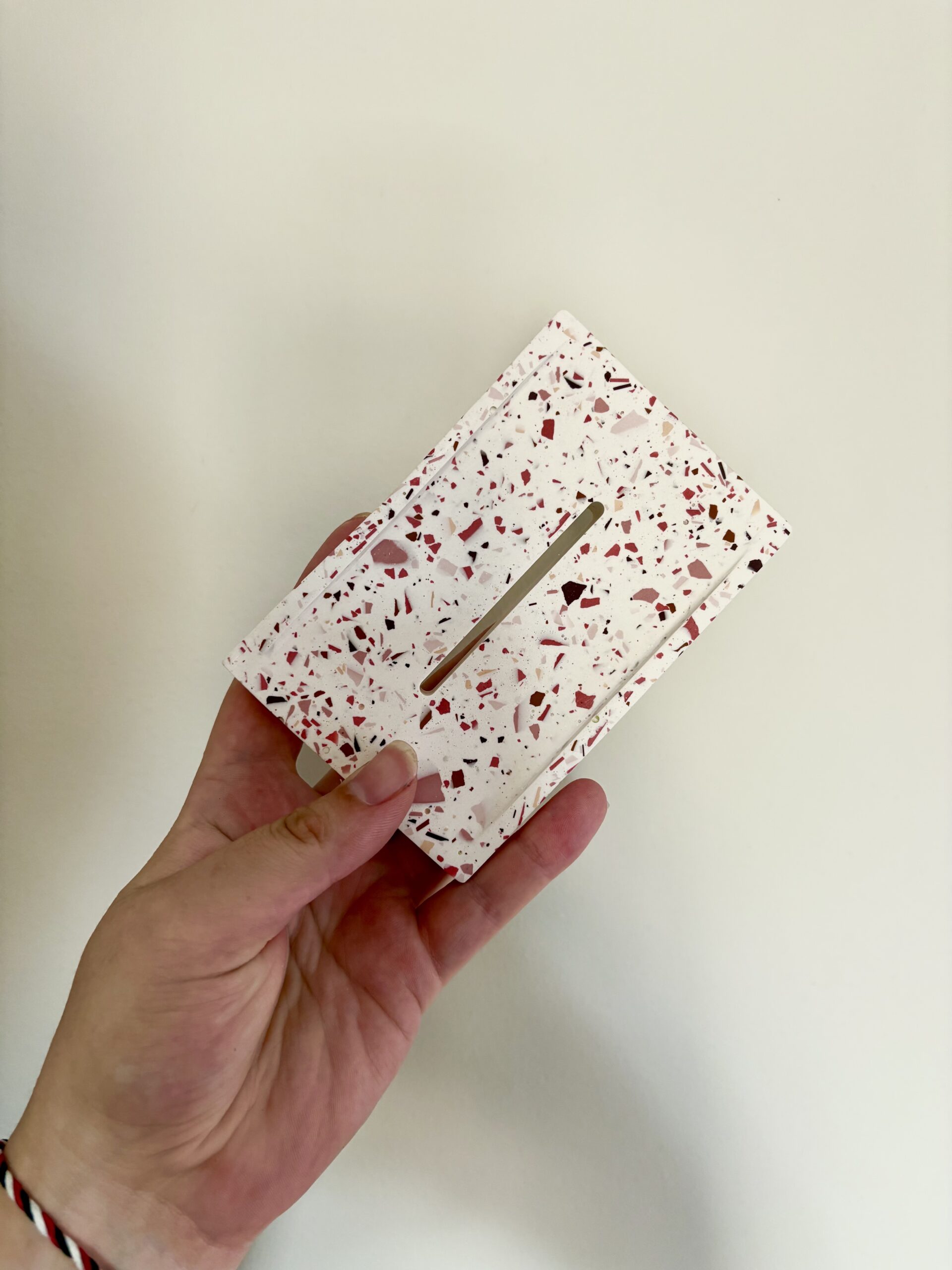 Apportez une touche de douceur et de modernité à votre salle de bain avec ce porte-savon en jesmonite, réalisé dans un style terrazzo raffiné. Son fond blanc éclatant est ponctué d’éclats de rose pour un rendu délicat et tendance.