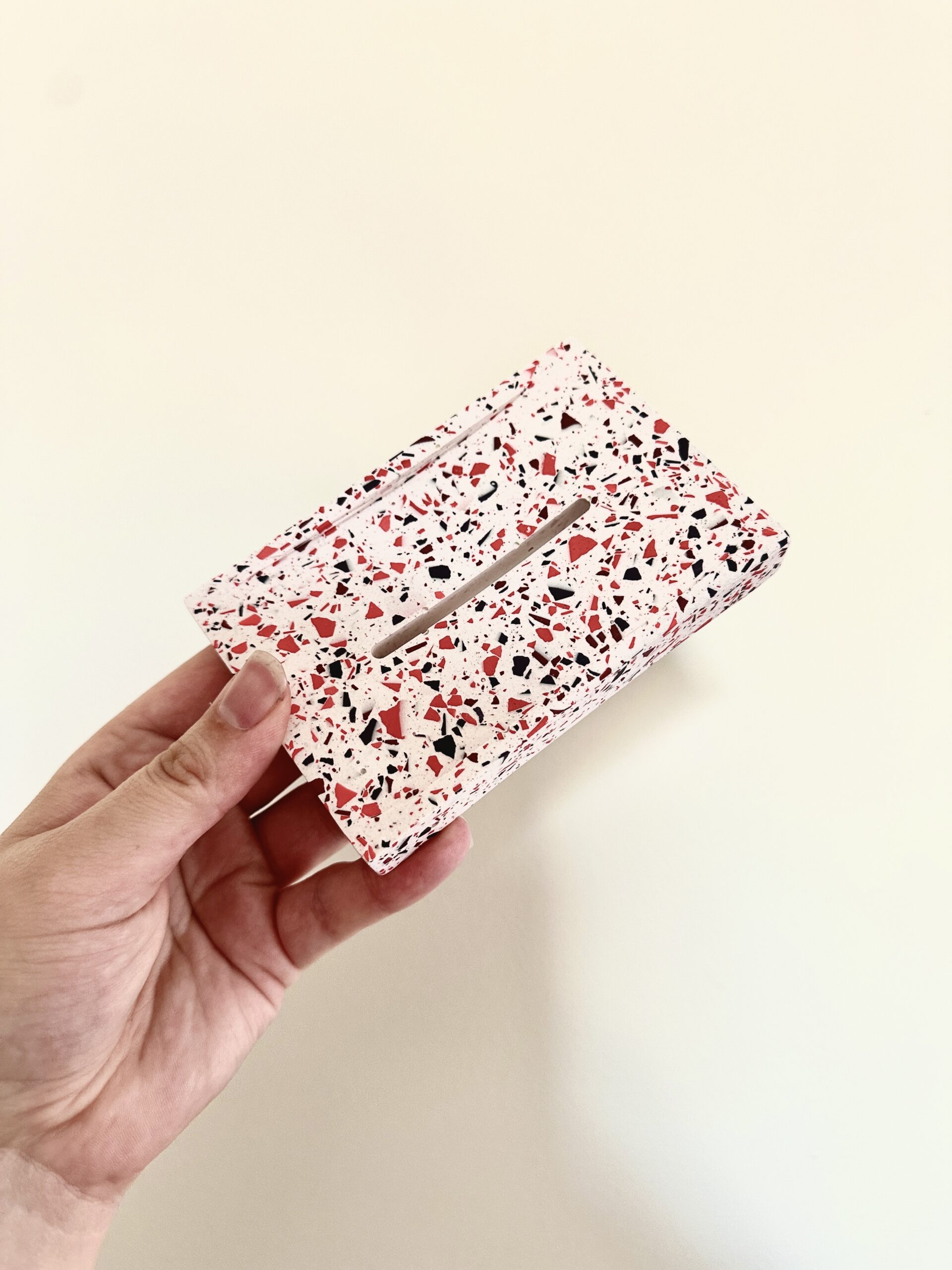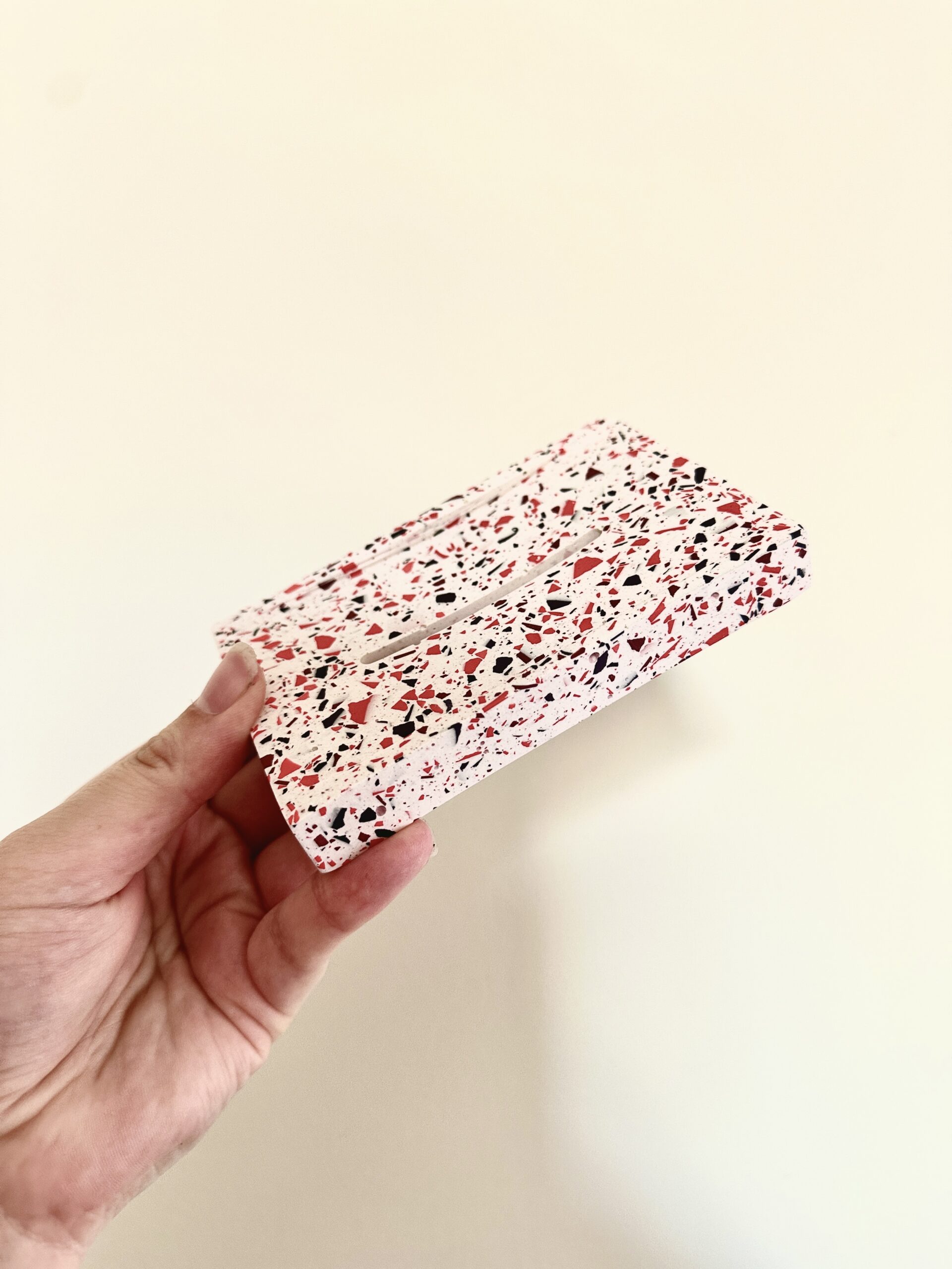 Apportez une touche de douceur et de modernité à votre salle de bain avec ce porte-savon en jesmonite, réalisé dans un style terrazzo raffiné. Son fond blanc éclatant est ponctué d’éclats de Rouges, bordeaux, mauve pour un rendu délicat et tendance.