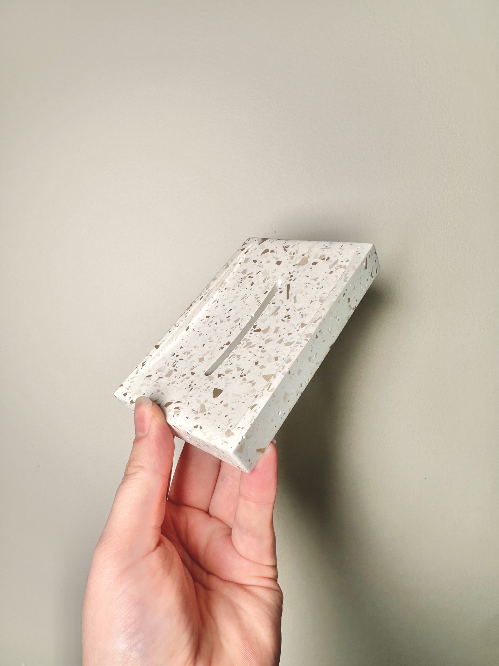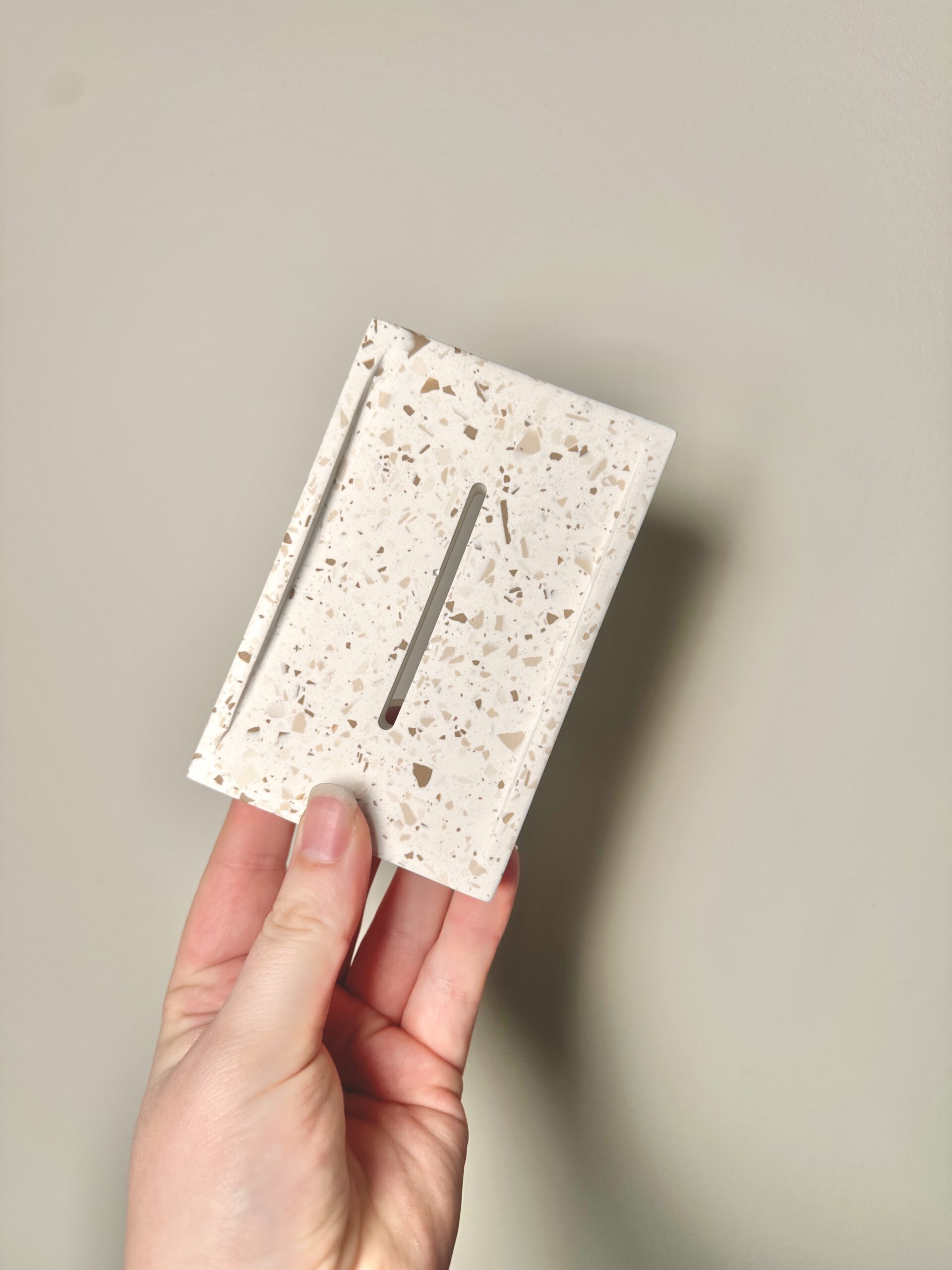 Apportez une touche de douceur et de modernité à votre salle de bain avec ce porte-savon en jesmonite, réalisé dans un style terrazzo raffiné. Son fond Blanc éclatant est ponctué d’éclats de beige pour un rendu délicat et tendance.