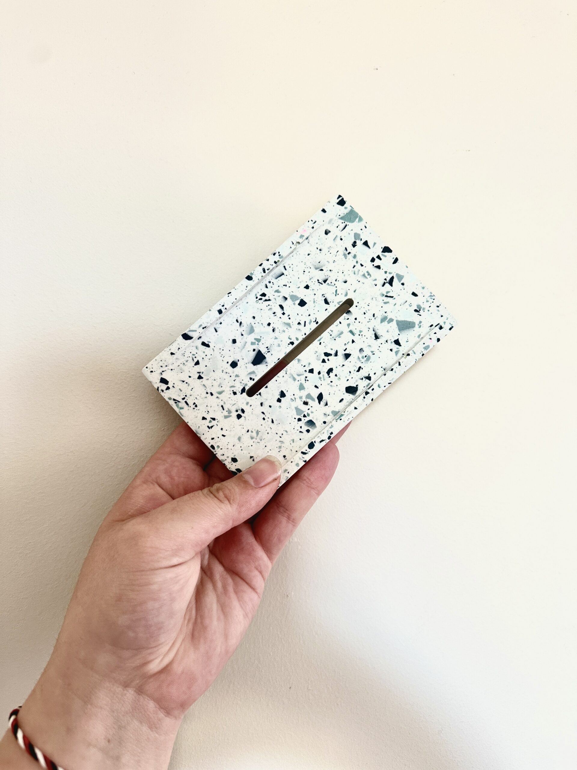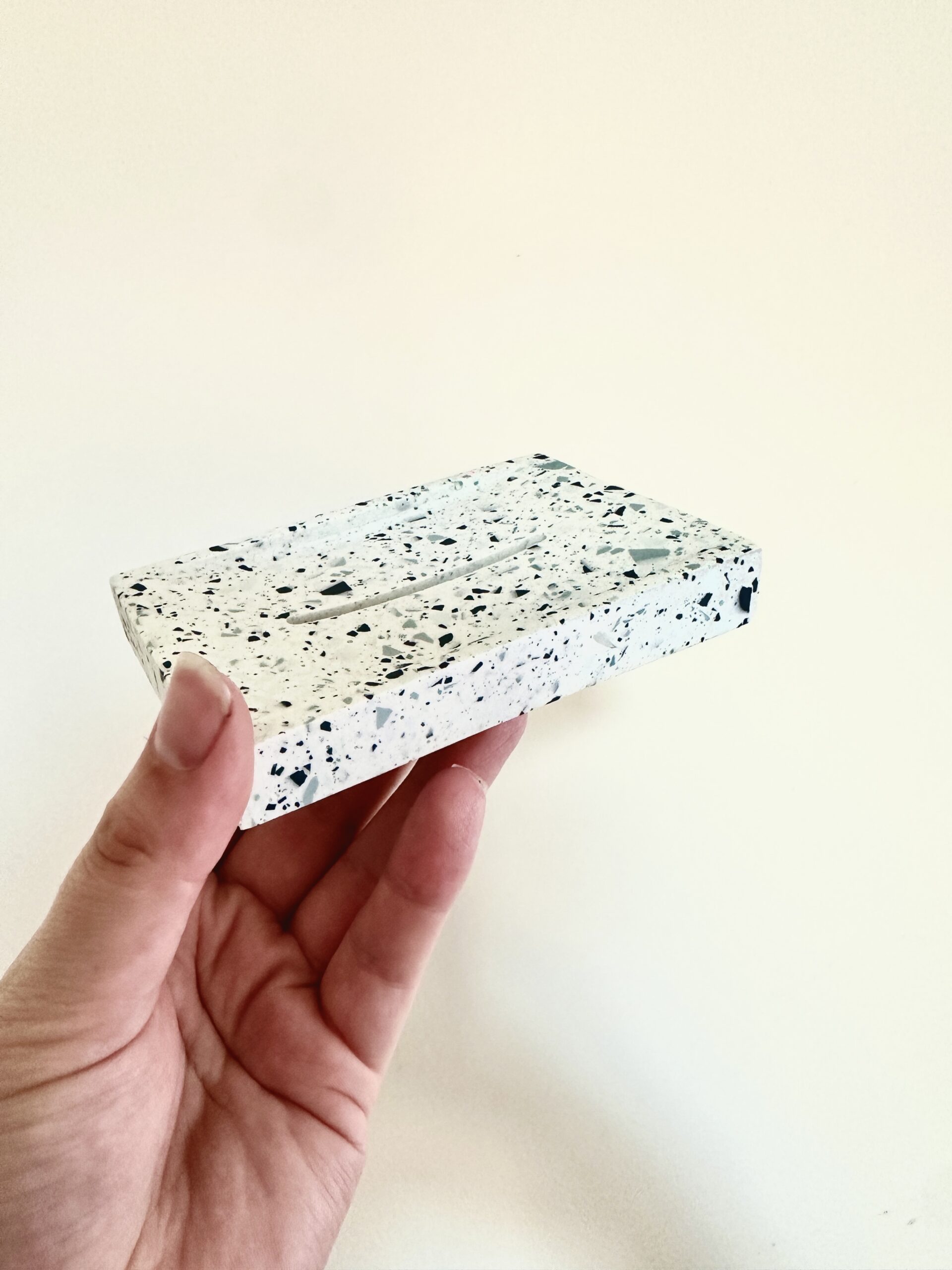 Apportez une touche de douceur et de modernité à votre salle de bain avec ce porte-savon en jesmonite, réalisé dans un style terrazzo raffiné. Son fond blanc éclatant est ponctué d’éclats de bleu pour un rendu délicat et tendance.