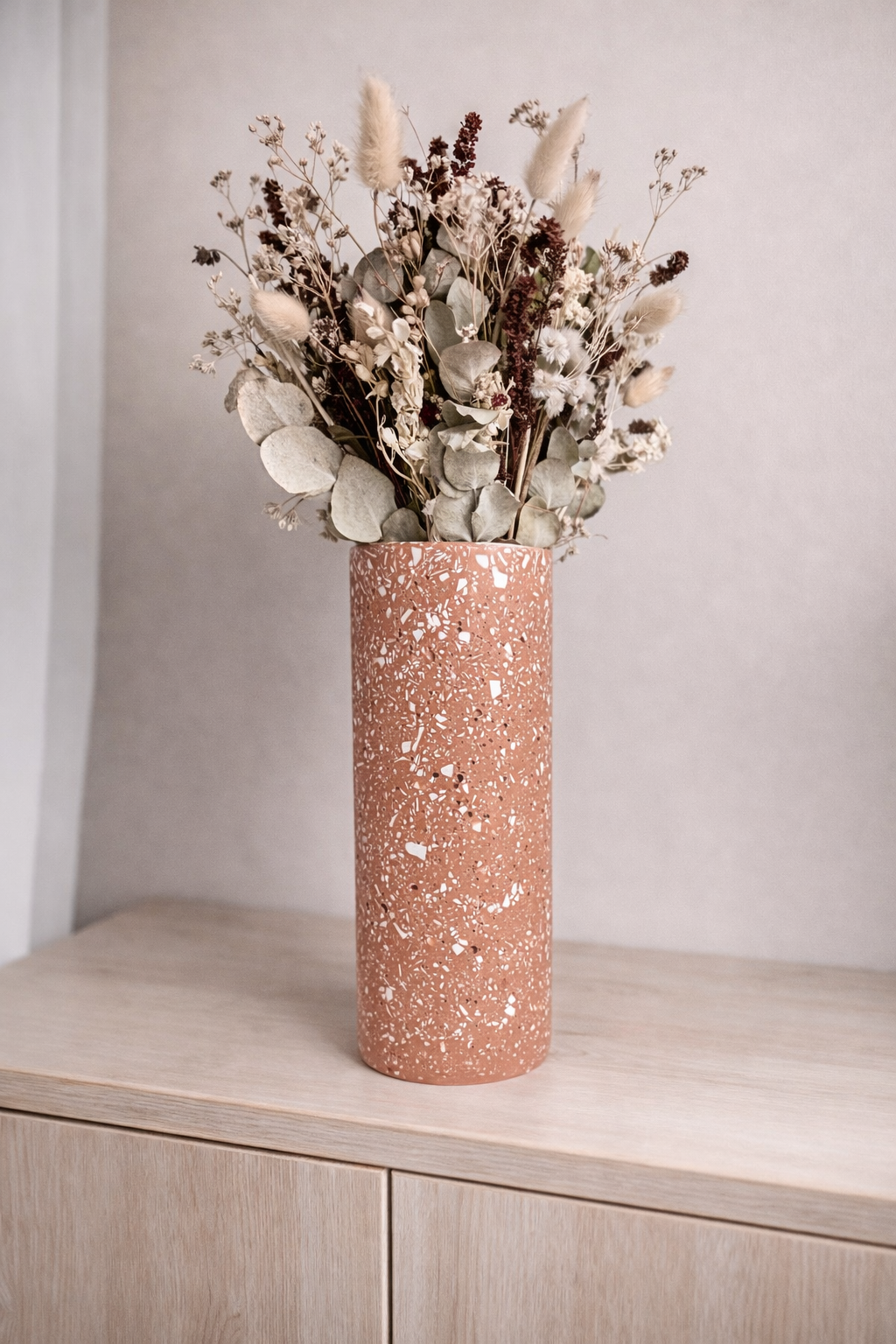 Lumineux et plein de fraîcheur, ce vase au fond terracotta est délicatement parsemé d’éclats terrazzo blanc