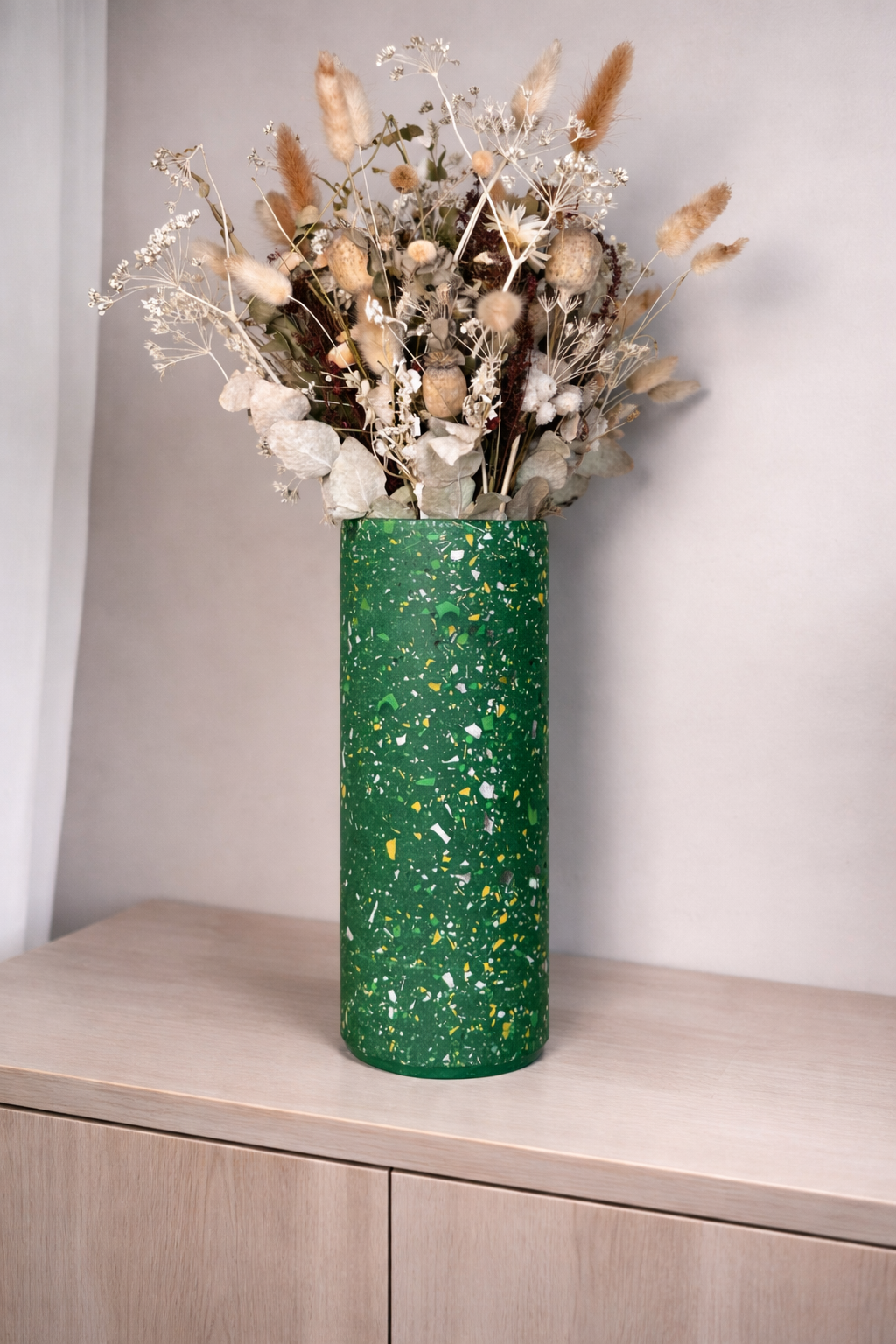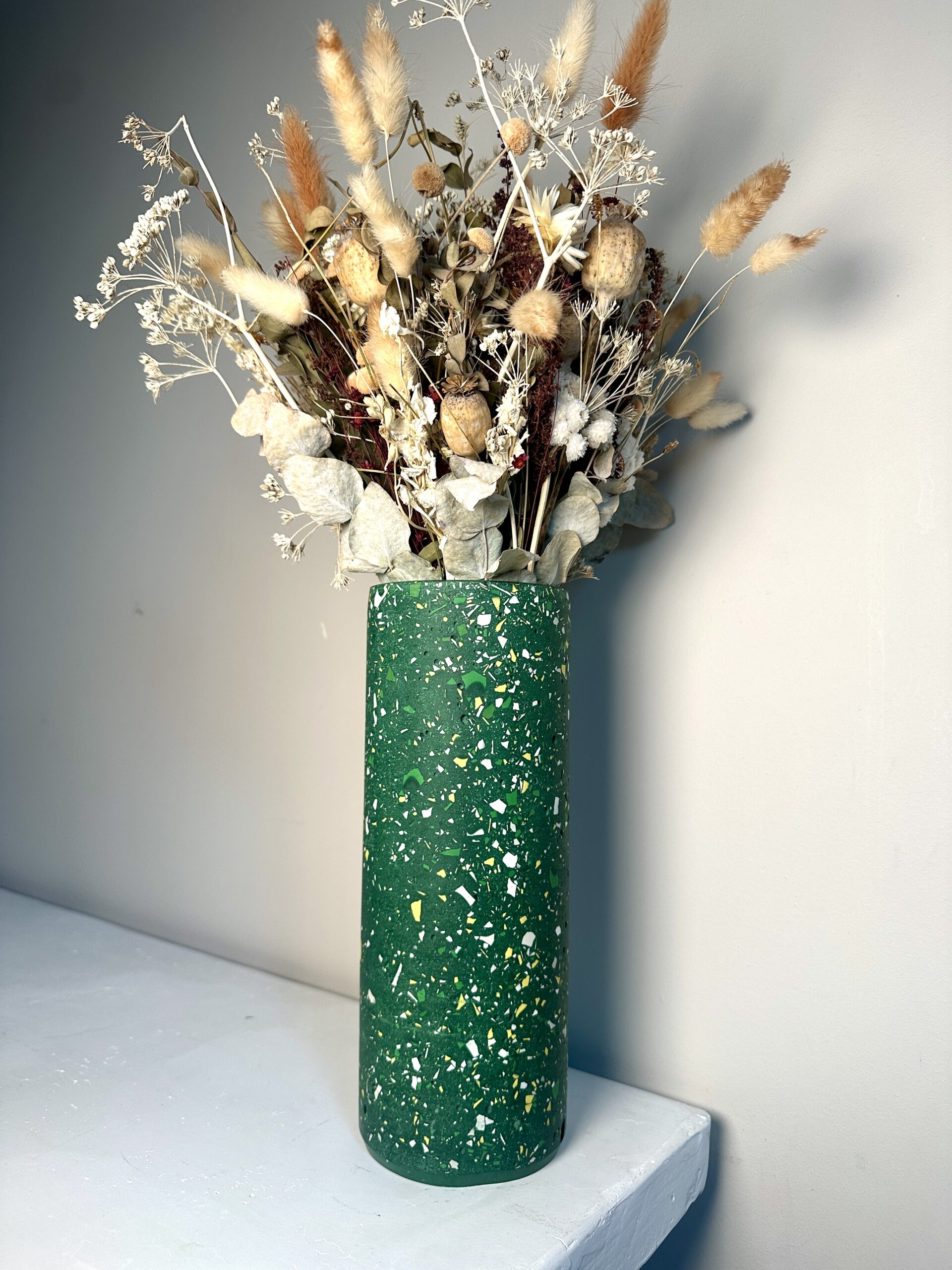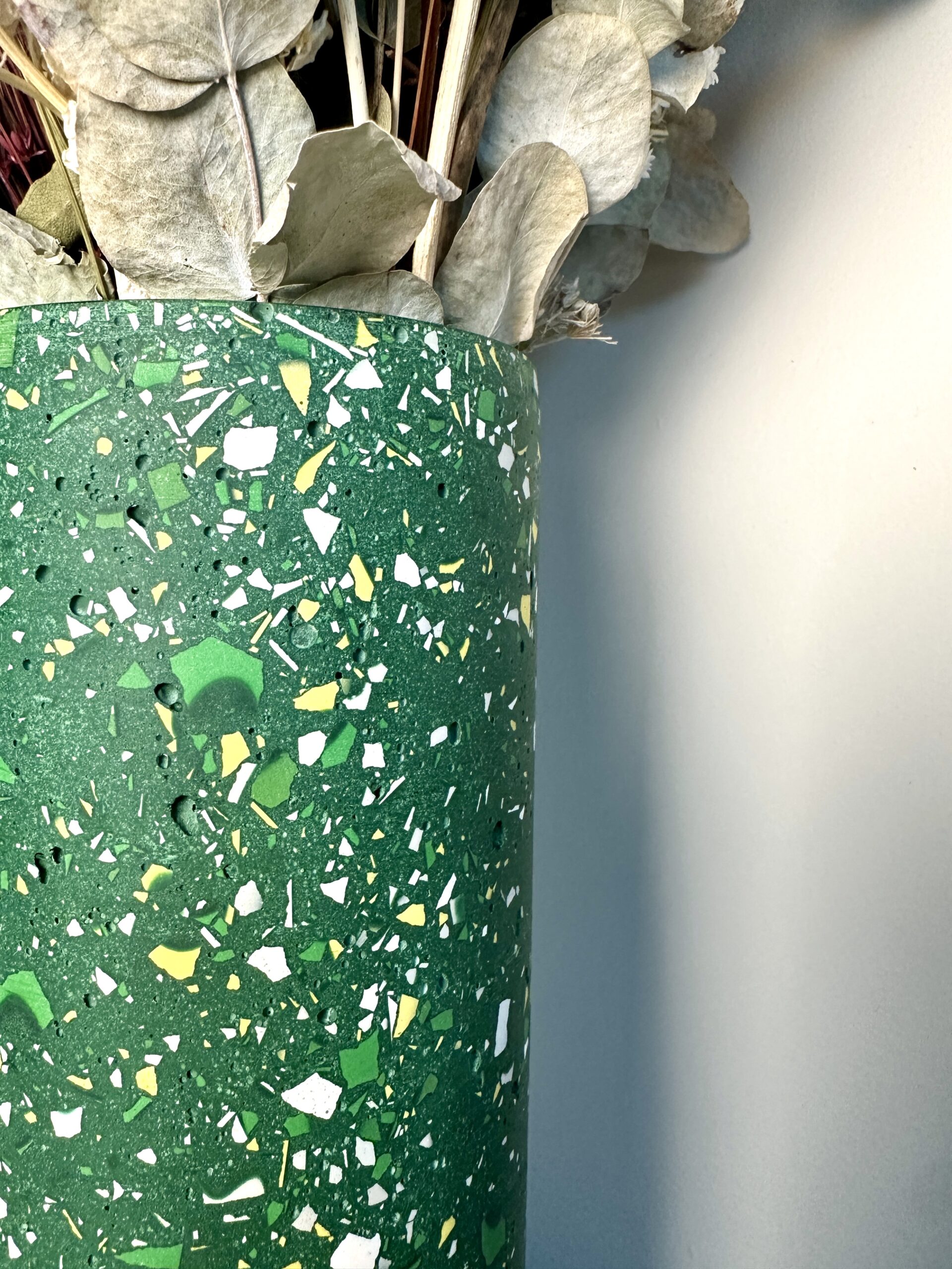 Lumineux et plein de fraîcheur, ce vase au fond vert est délicatement parsemé d’éclats terrazzo Blanc, vert, jaune et gris sur fond vert.